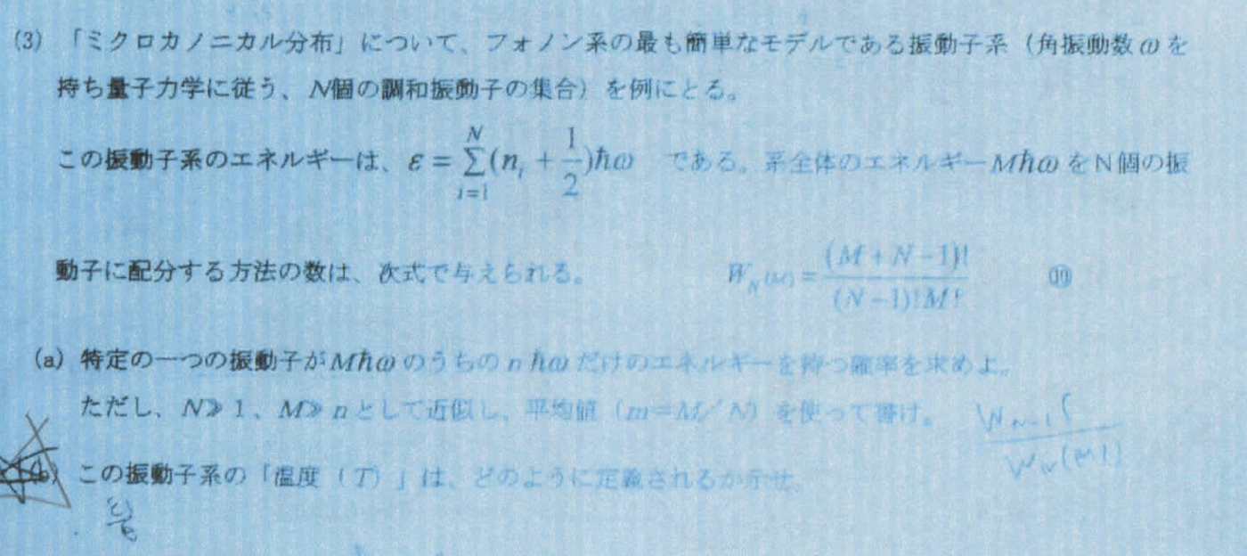 - はただ単に確率の問題を解くだけ。ここで、 \(W_N(M) = {}_N \mathrm{H}_M = \binom{M+N-1}{M}\) ということに注意した方がいい。
