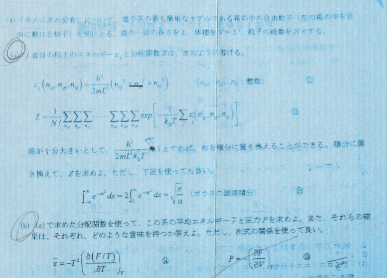 ある何らかの力が働いている系があ流として、そこでは圧力が定義可能である。 \(P=NkT\) となるわけだが、この系のうち、あるエネルギー \(E\) 以上を取る粒子が \(n\) 個存在してるとしたら、その割合は、 PE が圧力を超えていく確立に等しくて、 \(-n\dd P.E. = \dd P = kT \dd n\) で \(n\propto \exp(-P.E./kT)\) になるわけだけど、これを正規化するために \(Z = \sum \exp(-P.E./kT)\) をやっている。