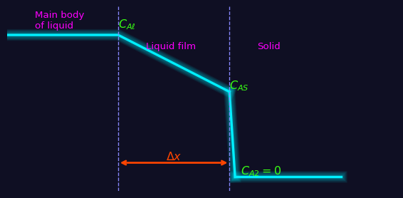 となる。ここで、左辺はフィックの拡散、右辺は表面における反応速度で、それぞれを式にして表すと次の通り。ただし単位は、単位長さあたりの変化率であることに注意。