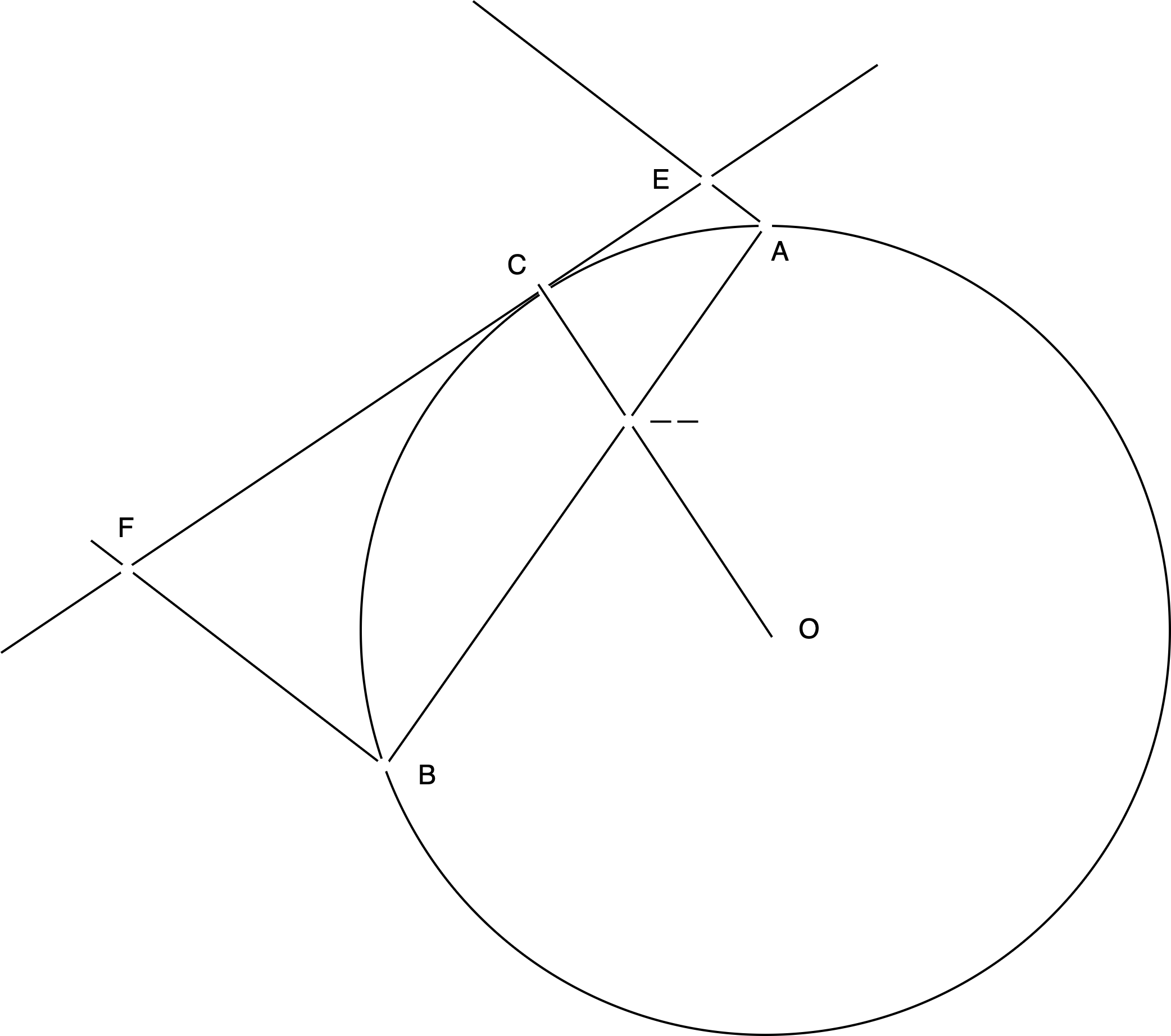 円Oがあり、その周上に点Aと点Bをとる。そして、弦ABの内の長くない方の弦に点Cをとる。そして、点Cで円Oに接する接線と、点A,Bを通るABと垂直な線分の交点をそれぞれ点E,Fとする。また、ABとOCの交点を点Dとする。